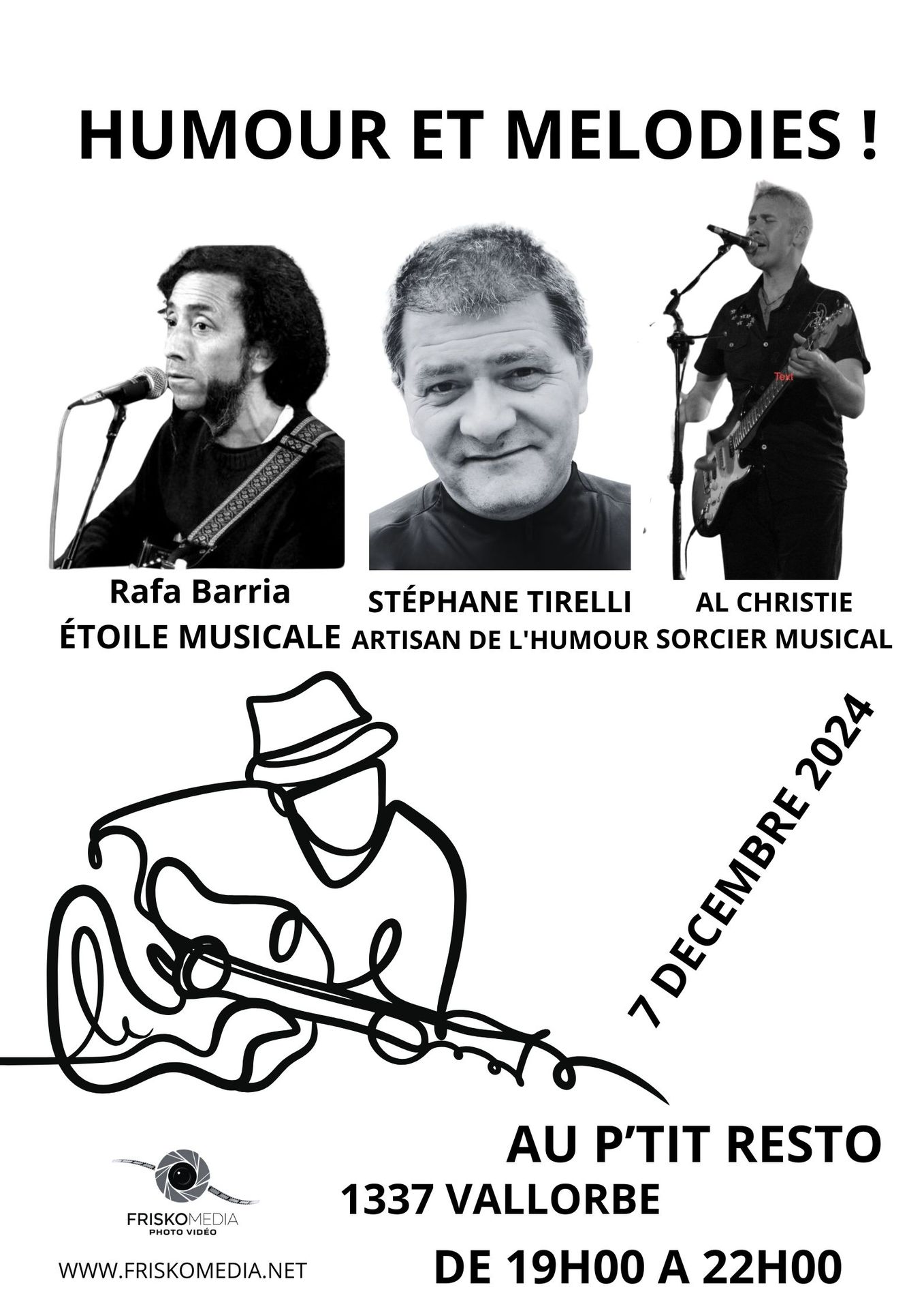 Ce samedi 07.12.24, le P'tit resto de Vallorbe accueille une soirée musicale exceptionnelle avec les talents de Rafa Barria et Al Christie, accompagnés de l'humoriste Stéphane Tirelli. Dans le cadre chaleureux du café kebab de Vallorbe, alors que la neige commence à recouvrir le sol et que la pluie persiste, l'atmosphère est empreinte de convivialité à l'approche des fêtes de fin d'année. Les musiciens s'échauffent vocalement et préparent leurs guitares, tandis que Stéphane savoure un café, un burger et des frites à volonté, ajoutant une touche gourmande à cette soirée festive.